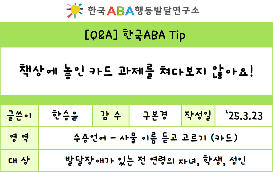 지금까지 아동이 책상에 올려진 카드를 잘 보지 않을 때 도움이 되는 팁을 알려드렸습니다. 실제 적용하시면서 아동의 효율적인 학습에 조금이나마 도움이 되시길 바랍니다. 다음 한국ABA Tip에서 또 뵙겠습니다. 감사합니다.