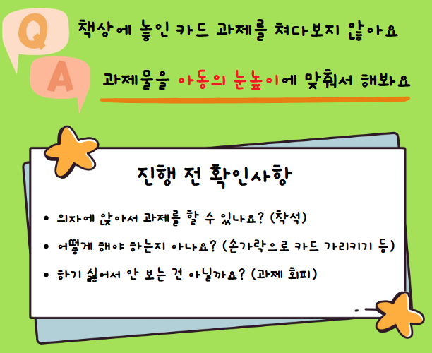 독서대로 올려진 카드로 과제를 잘 수행한다면 독서대나 구조물의 각도를 서서히 낮춰 카드 과제물을 책상 위에 올려두고 시행해 봅니다.