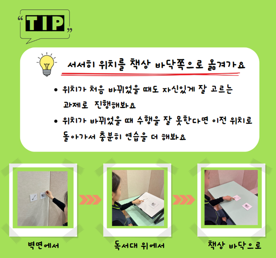 벽면에 붙어있는 카드 과제를 충분히 쉽게 수행한다면, 카드의 위치를 서서히 책상 위쪽으로 옮겨가기 시작합니다. 예를 들어 과제가 붙어있는 벽면 바로 밑에 책상을 가져다 놓고 책상 위에 독서대 등을 이용해서 벽면에 있던 카드의 위치가 조금만 옮겨지게 배치합니다(하단 사진 참조). 이때도 마찬가지로 아동이 바라보는 카드의 위치가 변경되었기 때문에 시행 초기에는 기존에 쉽게 수행하던 카드로 반복 연습하면 좋겠습니다. 만약에 위치를 내렸을 때 아동이 다시 카드를 잘 보지 않거나 과제를 회피한다면 다시 이전 단계(이전에 수행하던 위치)로 돌아가서 충분히 연습하고 천천히 위치를 조정해 보시길 바랍니다.