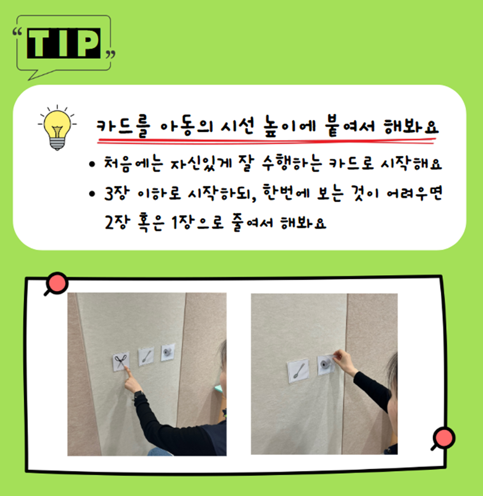 먼저 카드를 아동의 눈높이에 맞춰 벽에 붙여 진행하는 것을 추천 드립니다. 카드를 부착할 벽면과 카드 뒷면에는 벨크로를 부착하여 탈부착이 쉽도록 진행하면 더욱 좋겠죠? 시행 초기에는 카드를 정확하게 보게 하는 것이 목표이므로, 아동이 잘 알거나 좋아하는 사물 카드로 반복 시행하며 카드를 자신있게 잘 고르도록 해주는 것이 좋습니다. 또한, 벽면에 부착할 카드 수는 3장 이하로 진행하되 3장의 카드를 모두 탐색하는 것이 어려운 아동의 경우, 2장 혹은 1장으로 충분히 연습하시길 바랍니다. 물론 이 모든 과정에 있어 아동이 과제를 잘 수행할 경우 아주 큰 칭찬과 함께 아동이 좋아하는 강화물을 즉시 제공하는 것 잊지 마시구요!