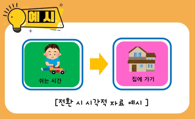 또한 우리 아이들은 전환 시 수행해야 하는 연속적인 세부 절차를 구체적으로 어떻게 해야 하는지 몰라서 어려움을 겪을 수 있습니다. 이럴 경우 전환 시에 필요한 절차를 시각적으로 안내해 주면 도움이 됩니다. 글씨를 잘 읽는 친구라 하더라도 그림을 함께 제시해 주면 훨씬 잘 이해하고 따를 수 있습니다. 전환 시 필요한 절차를 4~5단계 정도 제시하고 각 단계를 잘 수행할 때마다 작은 강화를 제시해 주면 도움이 됩니다.