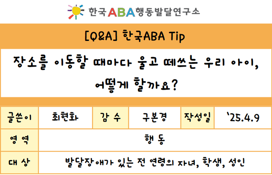 지금까지 장소를 이동할 때마다 떼쓰는 우리 아이에게 도움을 줄 수 있는 팁을 알려드렸습니다. 그리고 실제로 적용하시는 데 도움 드리고자 PPT 파일을 샘플로 첨부 했으니, 필요하신 분들께서는 다운로드 받으셔서 상황에 맞게 수정하여 사용하시기 바랍니다. 다음 한국ABA Tip에서 또 뵙겠습니다. 감사합니다.