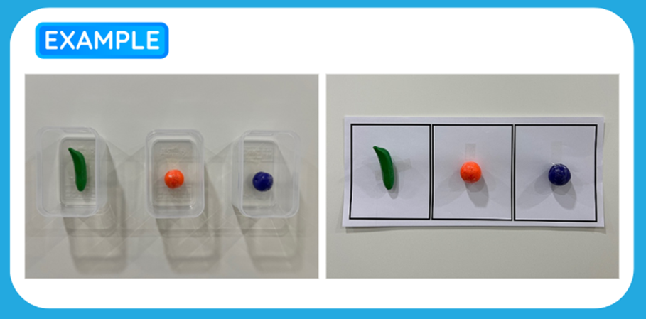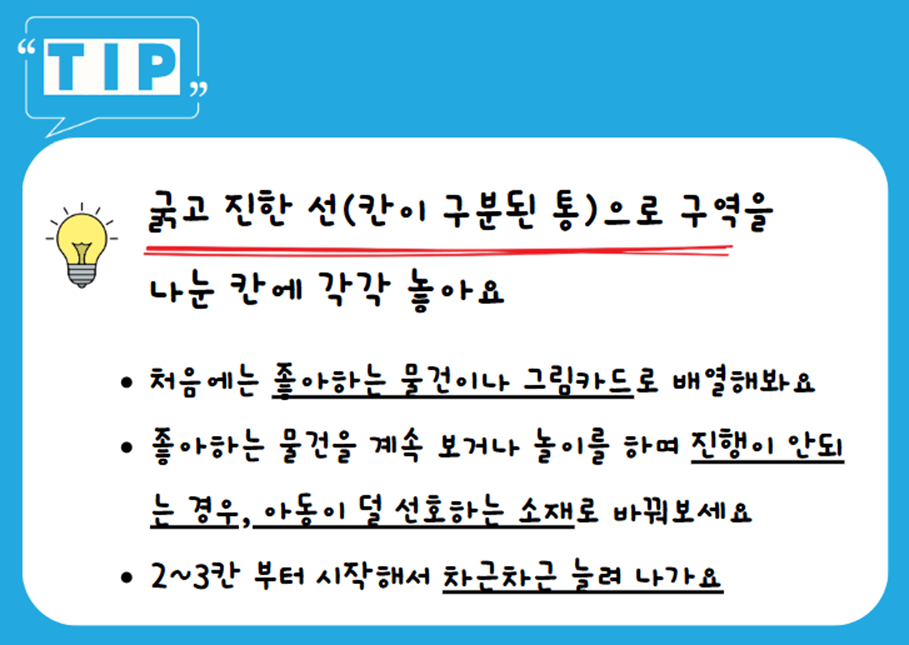 먼저 패턴 사이를 구역으로 나누어 놓습니다. 굵고 진한 선으로 칸을 나눠서 제시하거나, 칸이 나뉘어 있는 분류 통(칸 나눠진 도시락 통)을 활용합니다. 그리고 아동의 흥미를 유도하기 위해 처음엔 아동이 좋아하는 장난감, 캐릭터 스티커, 그림 카드 등으로 시작합니다. 단, 좋아하는 소재를 가지고 놀기만 하고 활동에 집중하지 못한다면 도형 카드나 색깔 블록처럼 중립적인 재료로 바꿉니다. 처음에는 3칸으로 시작하되, 한 번에 맞추는 것이 어려운 아동은 2칸부터 차근차근 연습합니다. 아동이 잘 따라하면 3칸 이상으로 천천히 늘려주세요. 그리고 무엇보다 과제를 잘 수행하면 그때그때 칭찬을 아끼지 않고, 즉시 강화물을 제공하는 것이 중요합니다.