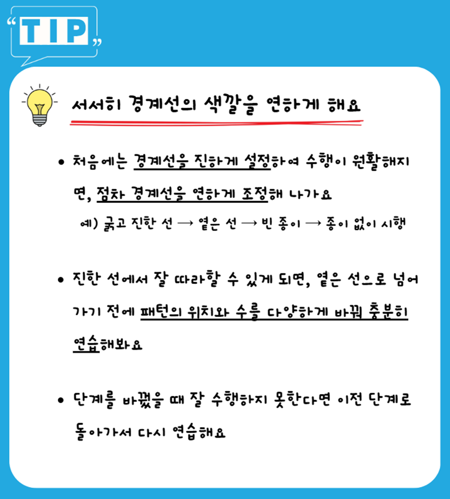 이제 아동이 굵은 선이나 구역이 나눠진 통에 잘 배열하기 시작했다면, 점차 아동이 독립적으로 과제를 해결할 수 있도록 도움을 줄여 나갑니다. 예를 들어, 처음에는 굵고 진한 선으로 구분해주고 이후에는 옅은 점선, 빈 종이, 마지막으로 종이 없이 진행하는 방식으로 점차 도움을 줄여 나갈 수 있습니다. 도움을 줄여 나가는 단계 사이사이에 패턴 모양과 순서를 바꿔서 충분히 연습하는 것이 중요합니다. 만약 새로운 단계에서 아동이 어려워한다면, 다시 한 단계 이전으로 돌아가서 연습해주시기 바랍니다.